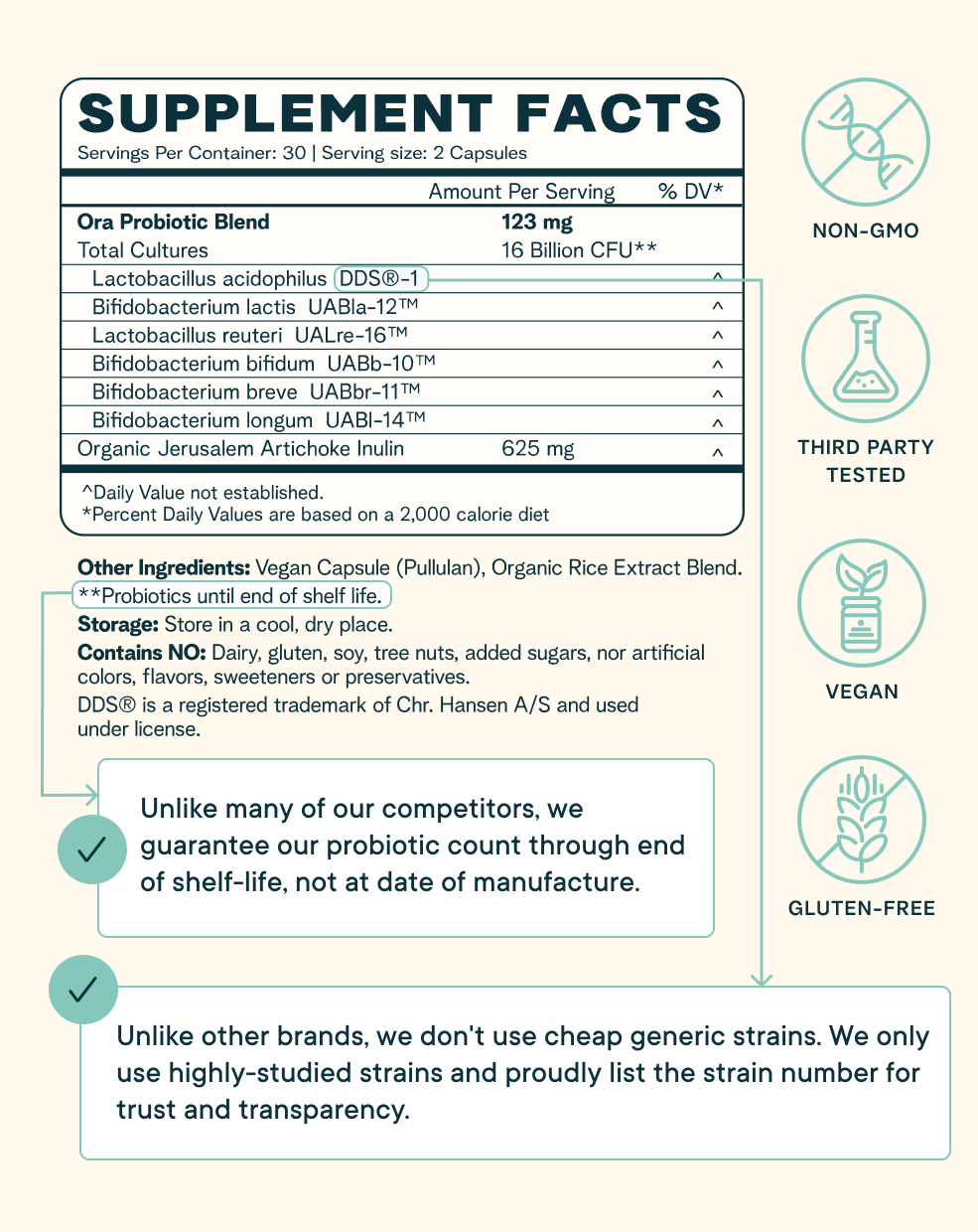 Lactobacillus acidophilus DDS-1, Bifidobacterium lactis UABla-12, Lactobacillus reuteri UALre-16, Bifidobacterium bifidum UABb-10, Bifidobacterium breve UABbr-11, Bifidobacterium longum UABI-14, Organic Jerusalem Artichoke Inulin, Vegan Capsule (Pullulan), Organic Rice Extract Blend