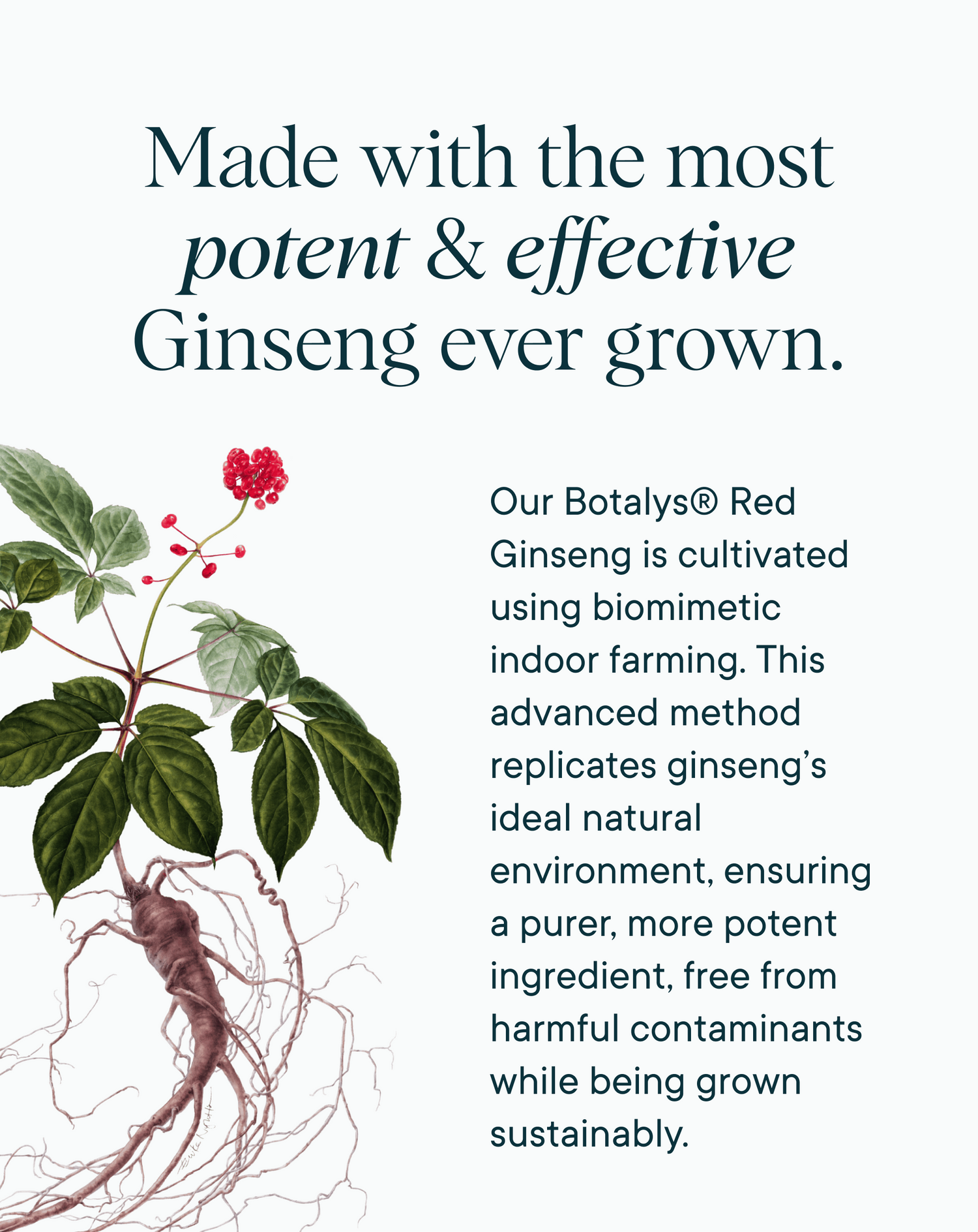 Botalys® Red Ginseng is sustainably grown using biomimetic indoor farming, ensuring it’s free from pesticides and heavy metals. It delivers the same potency as rare 20-year-old wild ginseng and has been clinically shown to reduce stress scores by 20% while improving energy levels and cognitive performance.