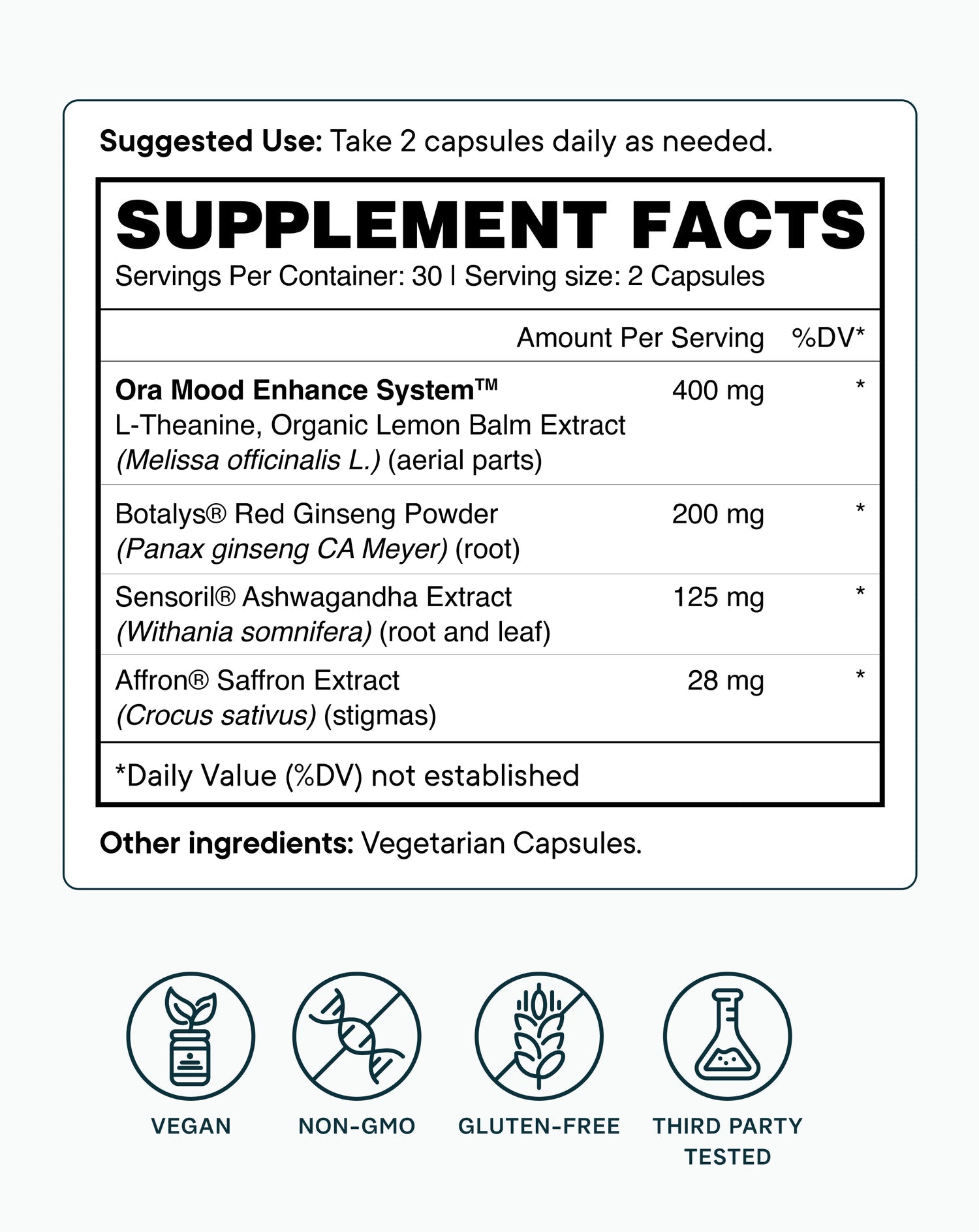 Stress Release combines clinically-studied ingredients like Botalys® Red Ginseng, Sensoril® Ashwagandha, and Affron® Saffron. These adaptogens and mood enhancers work synergistically to support cortisol levels, improve stress resilience, and promote relaxation, helping your body adapt to daily challenges.