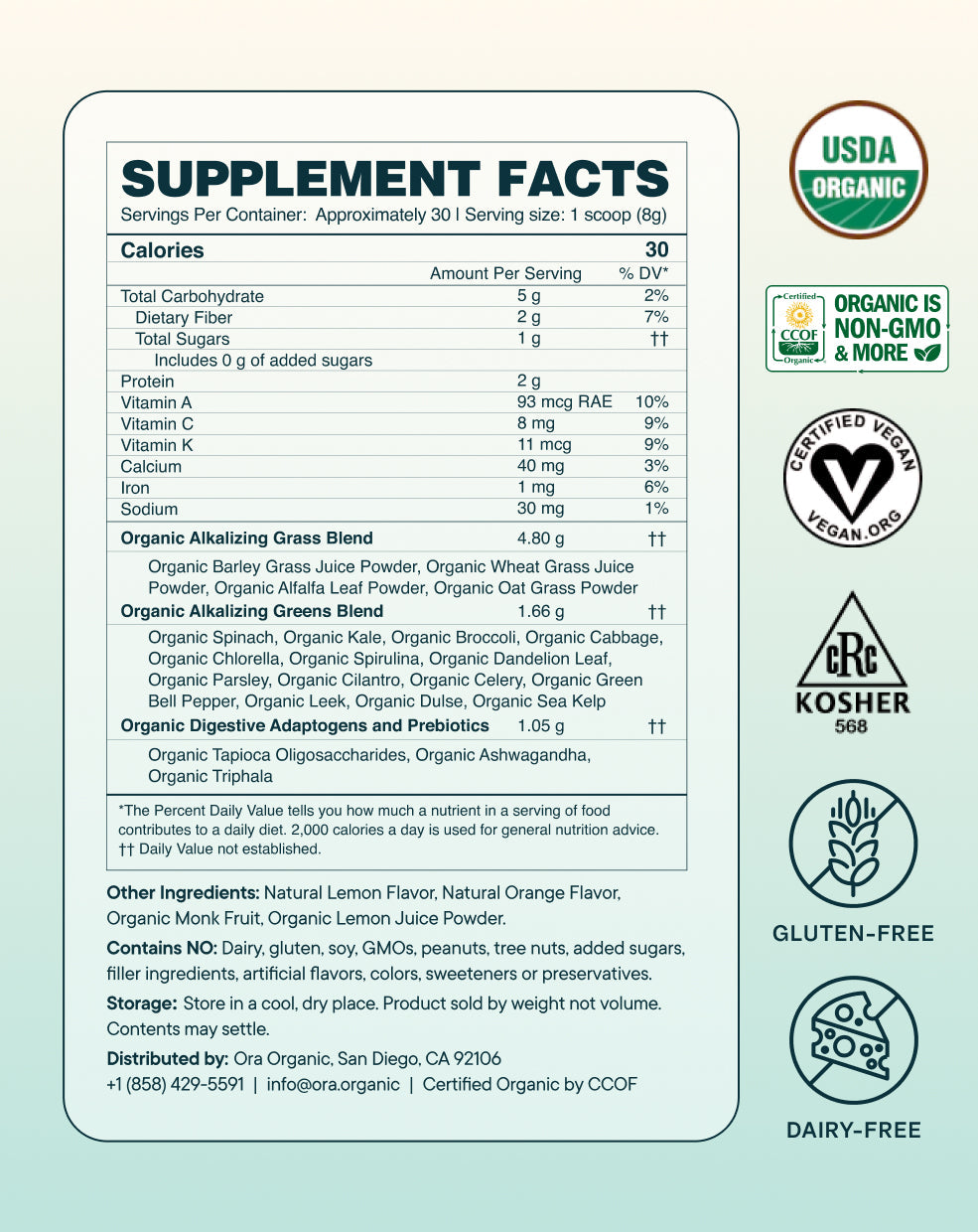 Synthetic pesticides are highly prevalent in conventionally-grown vegetables and fruits, particularly leafy greens. Greens that aren’t certified organic likely have some synthetic pesticides and insecticides coming along for the ride. We opt to leave those out and stick to delicious, nutritious, and organic greens, grasses, and seaweeds! Additionally, our orange flavor comes from organic fruit with no added sugar, filler ingredients, artificial flavors, or preservatives.